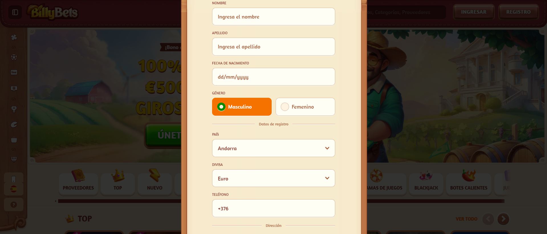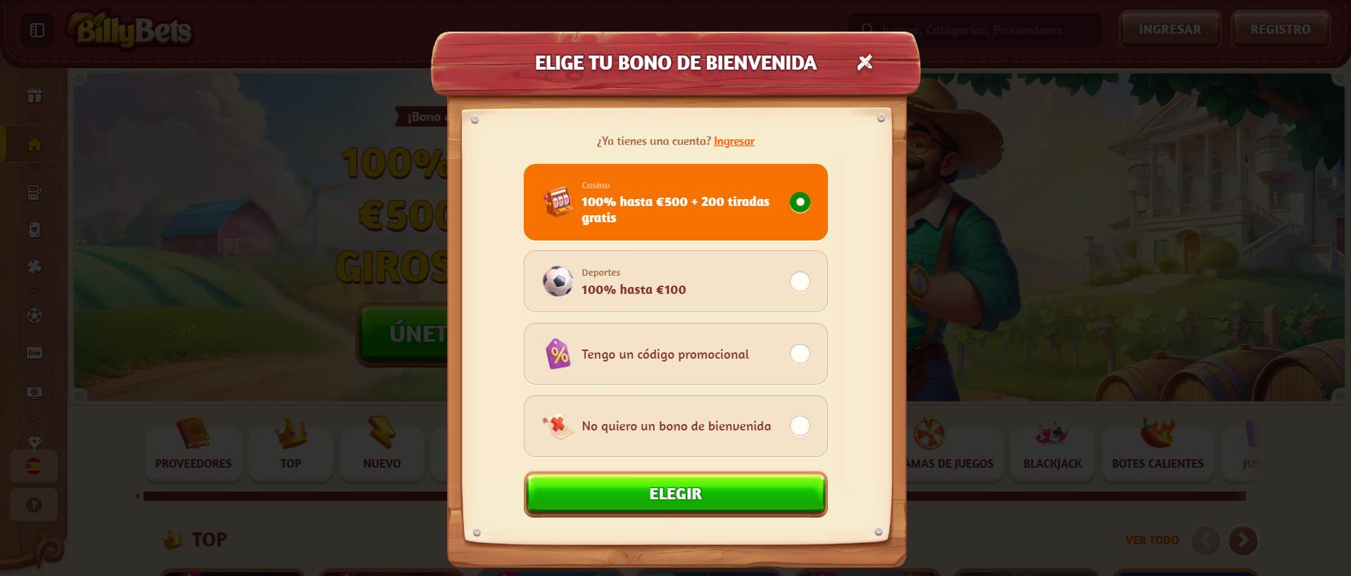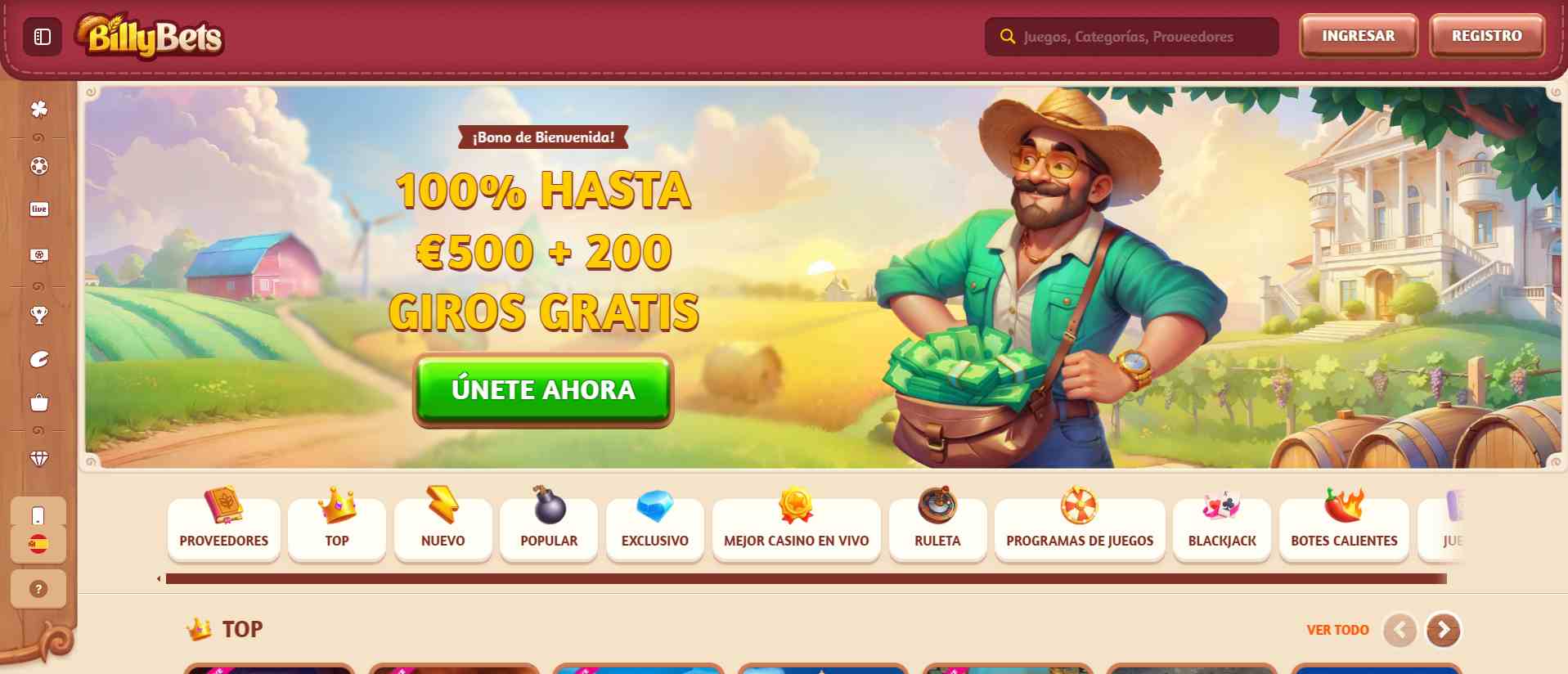 La plataforma se lleva por un tema de granjas y campos, con tonos amarillos, rojos y maderados que resultan agrada a la vista del usuario. En la página principal puedes hallar de primera el casino y los juegos que ofrece, también encontraras los botones de registro, ingreso y una barra de búsqueda en la parte superior. Hacia el lado izquierdo de la plataforma encontrarás un menú con das diferentes secciones que ofrece Billybets, centro de ayuda y los diferentes idiomas del sitio. En resumidas cuentas, Billybets es bastante intuitivo para cualquier tipo de usuario que decida jugar en el.